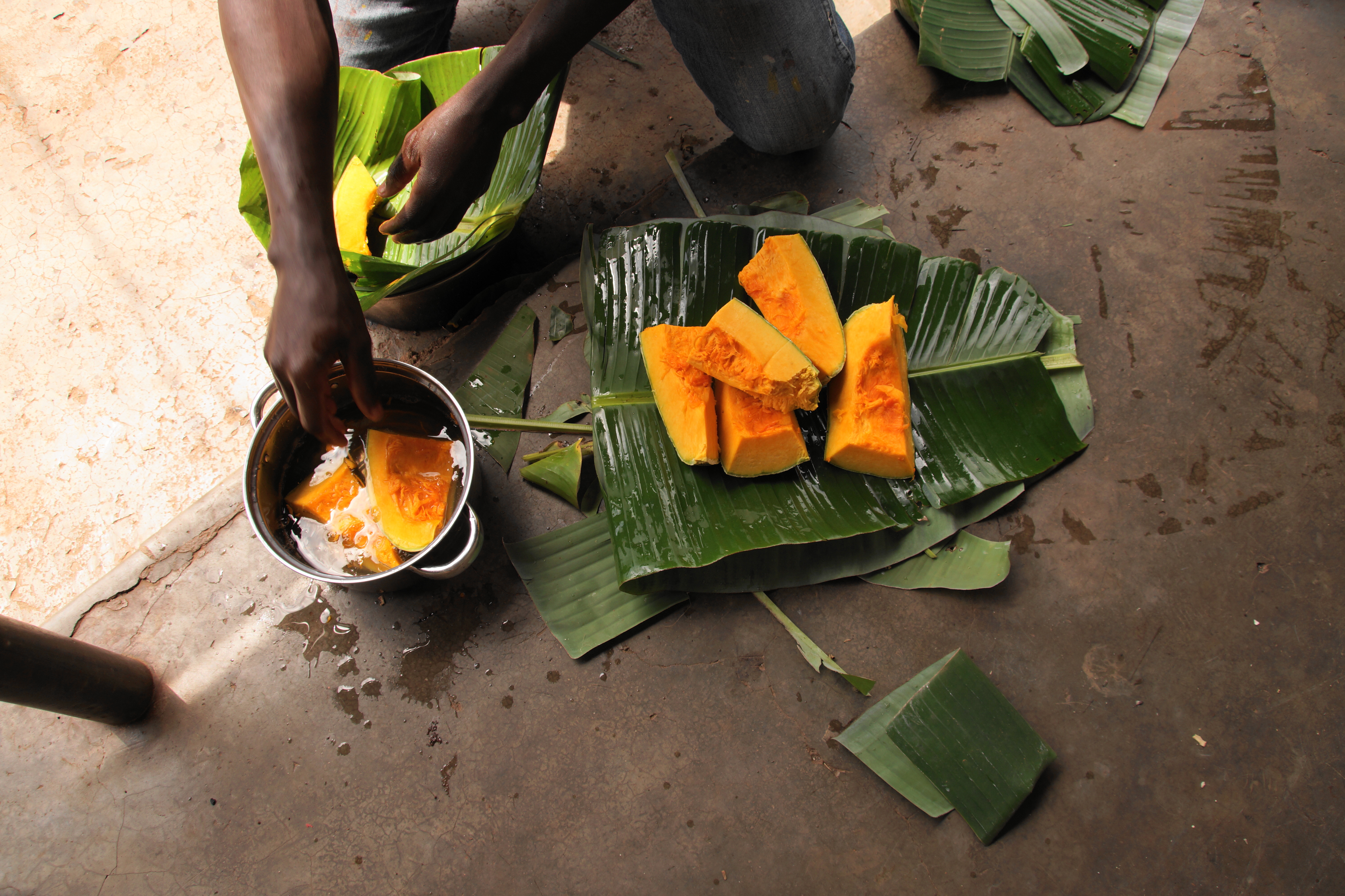 Startseite Birungi’s Koch und „Mann-für-Alles“ Stevie Kürbisstücke auf Blättern